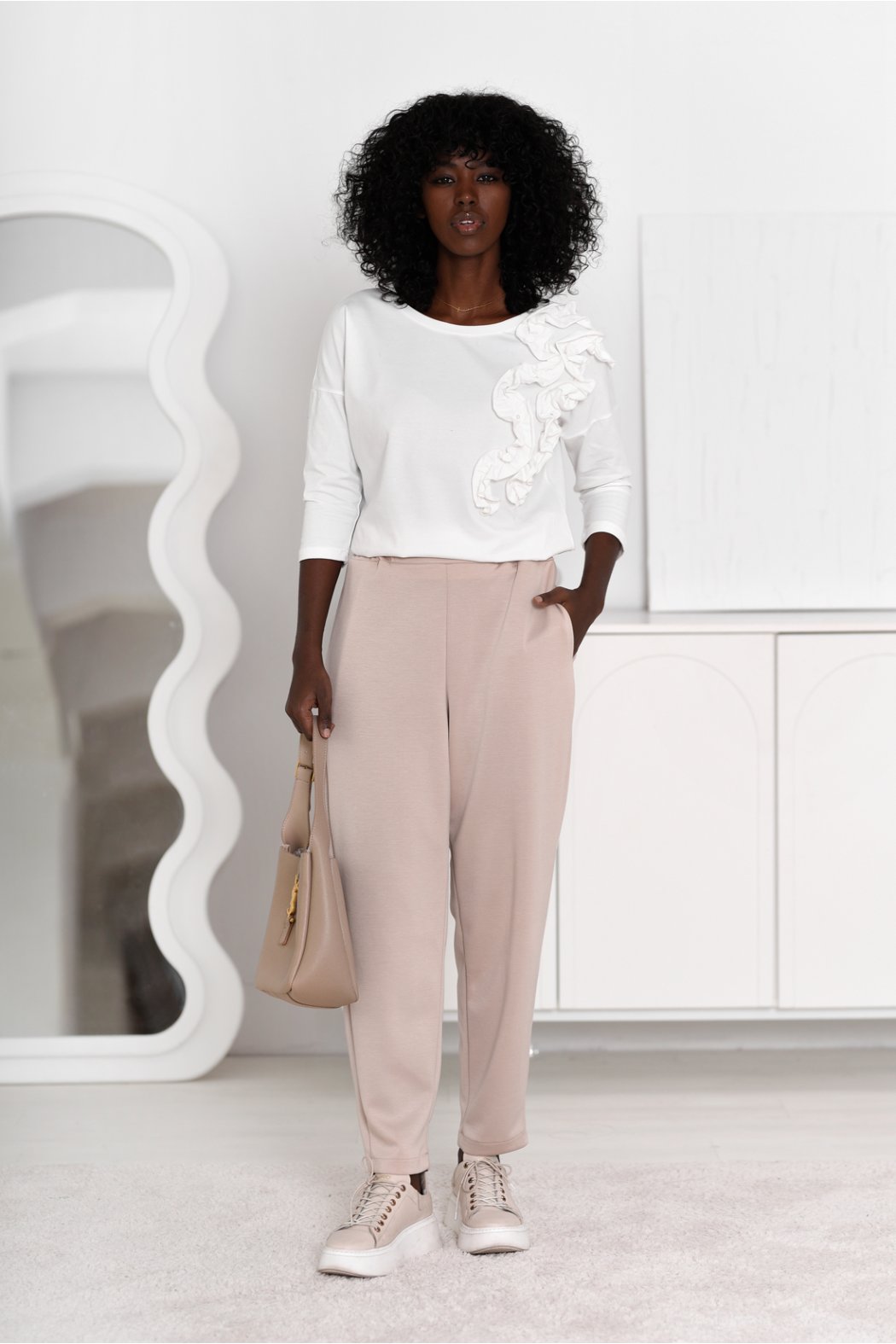 Bluzka damska z trójwymiarowymi falami, ozdobiona perełkami. Posiada rękaw 3/4. Dolna część bluzki jest zakończona prostą linią, która pozwala na różne sposoby noszenia – zarówno włożoną do spodni, jak i na zewnątrz.